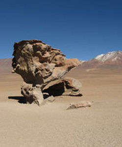Prima di partire dedichiamo qualche ora alla visita della laguna che, illuminata dalla luce mattutina, si mostra in tutto il suo splendore. I moltissimi fenicotteri che vivono sulle sue sponde non sembrano essere disturbati dalla nostra presenza e continuano a cercare il cibo nelle sue basse acque. Il paesaggio è molto suggestivo e la bellezza del posto ci aiuta a sopportare il freddo ed il vento gelido che continua a soffiare. Questa è sicuramente la località più bella osservata sino ad ora. Si prosegue con l’attraversamento del deserto di Siloli, 18 Km a nord della Laguna Colorada. Qui si incontrano diverse strane formazioni rocciose di cui la più nota è sicuramente quella chiamata “Arbol de Piedra”,Albero di Pietra.Questa conformazione, che assomiglia veramente ad un albero, è formata da una roccia erosa dal vento che si erge nella distesa desolata del deserto. Numerose e bellissime sono le lagune che costeggiamo: la Laguna Honda, la Laguna Chota, la Laguna Hedionda Nord a 4186 metri, molto ricca di fenicotteri, la Laguna Canapa a 4151 metri, un grosso lago salato circondato da alte montagne. Si parte, quindi, per la cittadina di Uyuni e il suo celebre Salar, una sconfinata distesa di sale con molte “isole” che sembrano spuntare dal mare. Il tempo non promette niente di buono, nonostante la leggera pioggia che ci accompagna il paesaggio non perde il suo fascino selvaggio. Il Salar de Uyuni, con i suoi 12.106 Km di superficie, costituisce la salina più grande della Bolivia. Questa parte dell’Altipiano era un tempo completamente sommersa dall’acqua. Nelle rocce calcaree di quello che doveva essere un lago sono visibili fossili di corallo. I depositi salini derivano dai minerali provenienti dalle montagne e depositatisi nella zona. Oggi il Salar è diventato una zona di estrazione e lavorazione del sale che ha il suo epicentro nella cittadina di Colchani, situato a 20 Km da Uyuni. Quando la superficie si asciuga, le saline trasformano il paesaggio in una bianca distesa accecante dalle dimensioni infinite, quando invece queste pianure si ricoprono d’acqua, si formano degli specchi che riflettono alla perfezione il paesaggio e l’orizzonte scompare. Attraversando questi pianori l’effetto è soprannaturale e sembra di essere sospesi nell’aria.Tra le molte “isole” che sorgono dalla bianca distesa di sale, la più famosa è certamente l’incantevole Isla del Pescado.