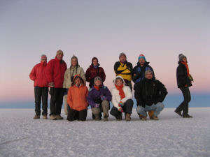 Alle 19.30, quando già è arrivato il buio, arriviamo al villaggio; la sistemazione spartana in una costruzione gelida, priva di illuminazione e di riscaldamento, non è sufficiente per far diminuire il morale del gruppo che rimane decisamente sempre molto alto. Per scacciare il freddo terminiamo la cena a lume di candela ed indossando la giacca a vento, riscaldandoci con un caldo “vin brulè” o, come lo chiamano i locali,“vino caliente”. Levataccia e partenza alle 5 del mattino per andare ad ammirare l’alba alla Laguna Celeste,meta ancora poco nota ai viaggiatori ma che merita certamente una visita, specialmente se si arriva sulle sue sponde prima del sorgere del sole. Cerchiamo di mitigare il freddo pungente dei momenti che precedono l’alba accendendo diversi fuochi sulle sponde della laguna.All’alba le sue acque si dipingono di colori che si fanno via via più caldi ed il riflesso delle montagne che vi si specchiano formano un paesaggio di una bellezza irreale: i disagi affrontati sono tutti ampiamente ricompensati! I paesaggi che si incontrano durante il tragitto sono sempre stupendi, si attraversa un territorio con vulcani ancora attivi, geyser, acque termali, lagune e deserti di sale. Il terreno è saturo di minerali che,mischiandosi all’acqua, producono colori impensabili creando lagune spettacolari. Molte sono le lagune ed i salares che si incontrano, tra cui: la Laguna Hedionda Sur, la Laguna Collpa con le sue formazioni di borace, il salar de Chalbri, la Laguna Polchis, anch’essa con formazioni di borace, la Laguna Verde, dalle sfumature di colori impensabili che passano dal verde al blu, situata in una zona esposta e sempre battuta da un vento gelido, dietro la quale si erge l’immenso cono di 5960 metri del vulcano Licancabur. L’ultima laguna che si incontra, prima del confine cileno, è la Laguna Blanca.